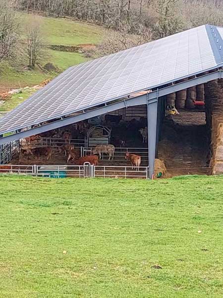 Il s’agit d’une forme d’agrivoltaïsme, où agriculture et solaire photovoltaïque s’associent pour créer une synergie gagnante. C’est précisément le modèle déployé dans les projets d’agrivoltaïsme ovin ou agrivoltaïsme bovin : un toit équipé de panneaux solaires photovoltaïques capte l’énergie lumineuse du soleil, la convertit en électricité décarbonée pour réduire les coûts énergétiques de l’exploitation et/ou générer des revenus supplémentaires pour l’exploitant.