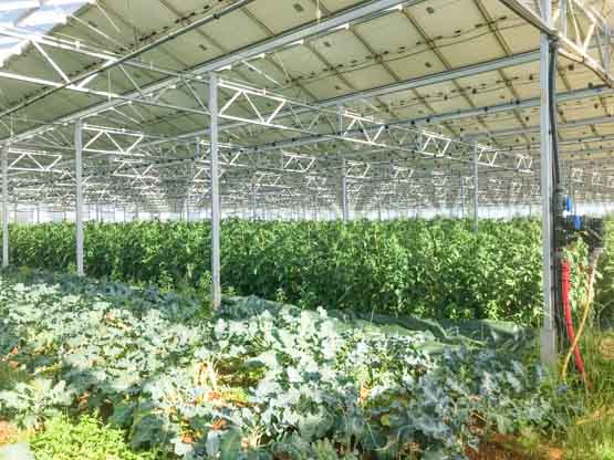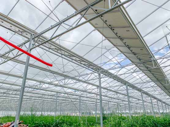 Notre modèle de serre avec une haute couverture (50%) est conçu pour les cultures qui nécessitent un pilotage plus fin de leur environnement. Grâce à un vitrage diffusant, nous transformons la lumière directe en une lumière diffuse qui se répartit de manière homogène sur les cultures. Cela permet d’éviter les carences lumineuses, de limiter le stress hydrique et d’améliorer la photosynthèse, même avec un fort ombrage.