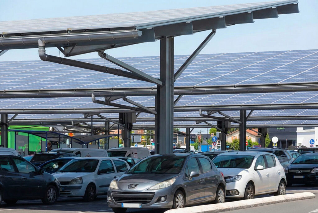 Une ombrière de parking photovoltaïque est une structure de couverture installée au-dessus d’un parc de stationnement, dont la toiture est constituée de panneaux solaires. Elle remplit une double fonction : protéger les véhicules des intempéries et du soleil, tout en produisant de l’électricité grâce au rayonnement capté.