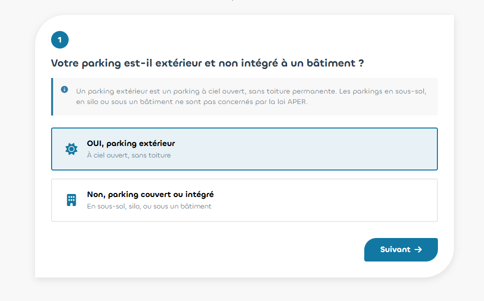 En répondant à quelques questions sur votre parking — superficie, usage, date de construction — le simulateur analyse votre situation au regard des seuils réglementaires et vous indique clairement : êtes-vous soumis à l’obligation, et si oui, pour quelle échéance ? Plus besoin d’interprétation incertaine : vous obtenez une réponse directe, basée sur les critères législatifs en vigueur.