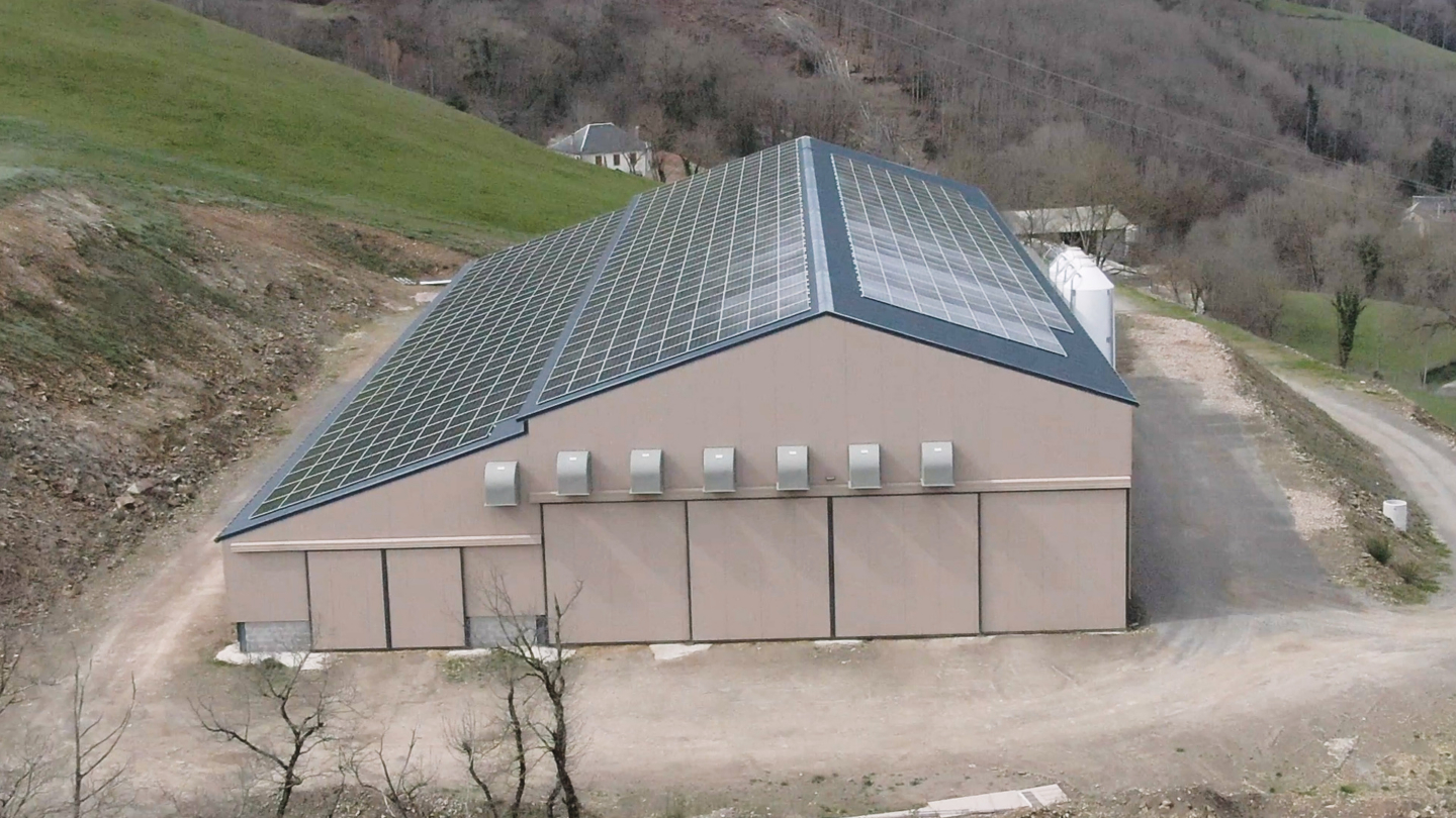 Ce bâtiment photovoltaïque permet à un éleveur d’ovins de développer son activité et de valoriser son terrain tout en améliorant ses conditions de travail et le bien-être de ses animaux. L’espace est dédié au stockage de fourrage et à la bergerie (agneaux, brebis laitières).