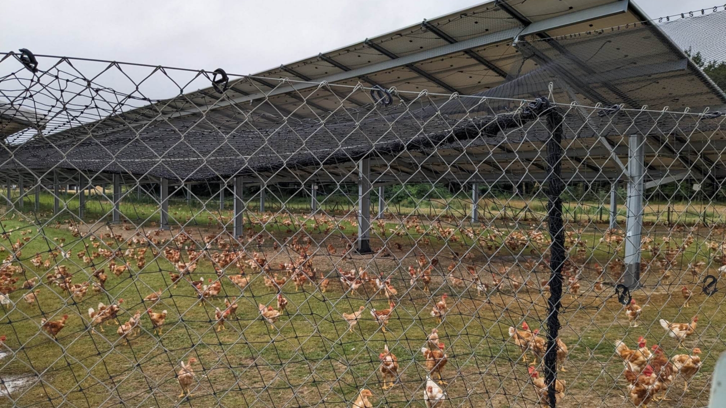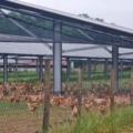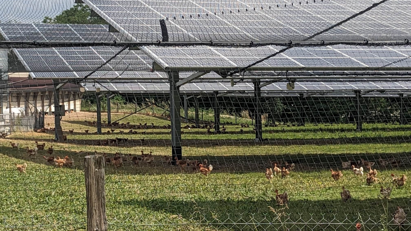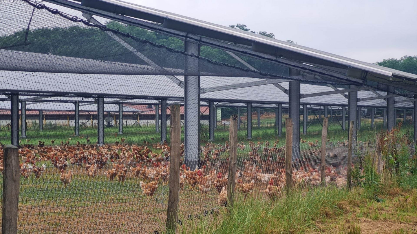 Localisé dans le Lot-et-Garonne, le parc solaire de type volière de Puysserampion est construit sur un hangar d’élevage de poulets et a une puissance totale de 2,1 MWc.
