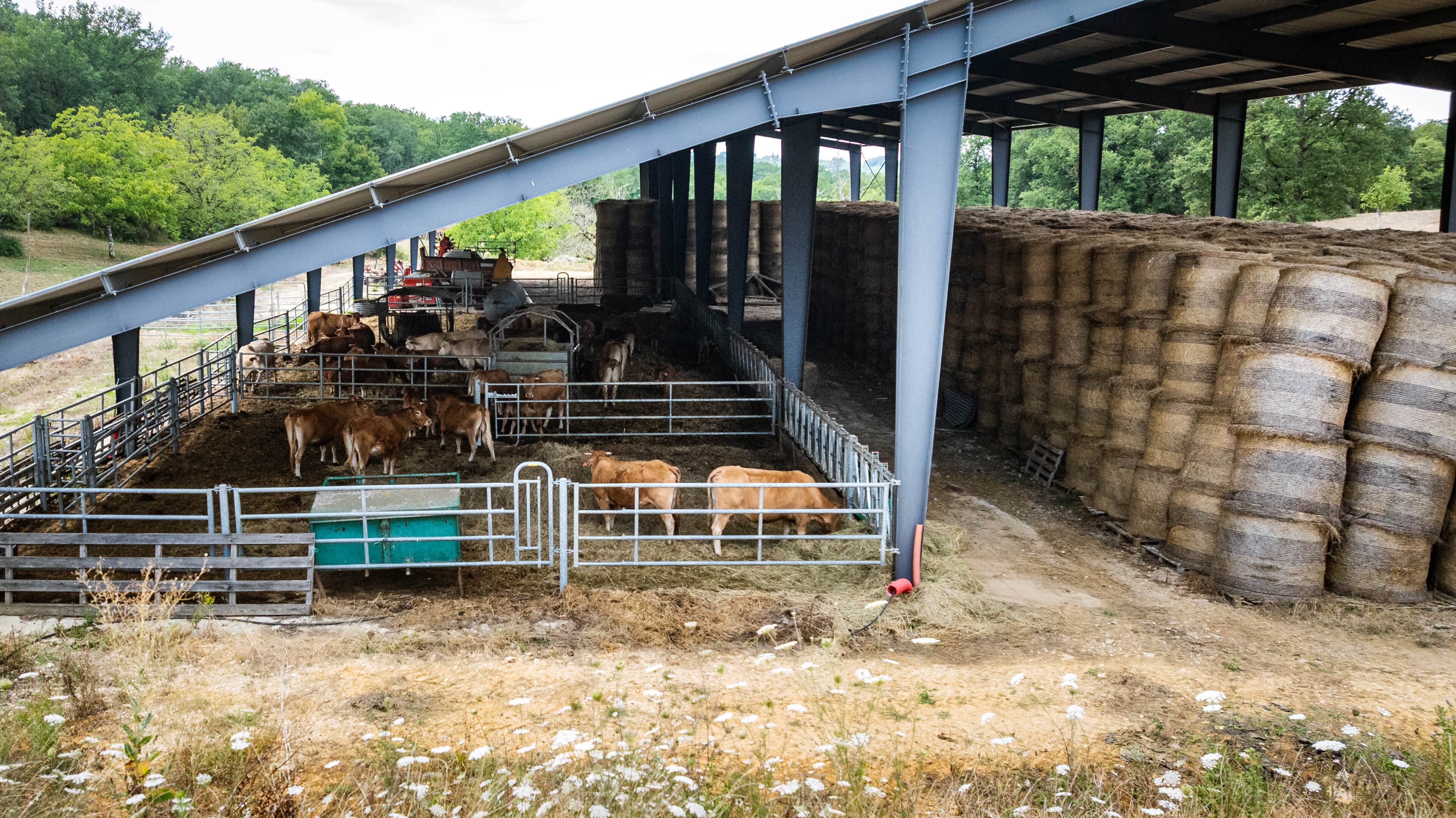 - Aire paillée et logettes : zones de repos conçues pour le confort du troupeau (stabulation libre ou entravée), avec un dimensionnement adapté.